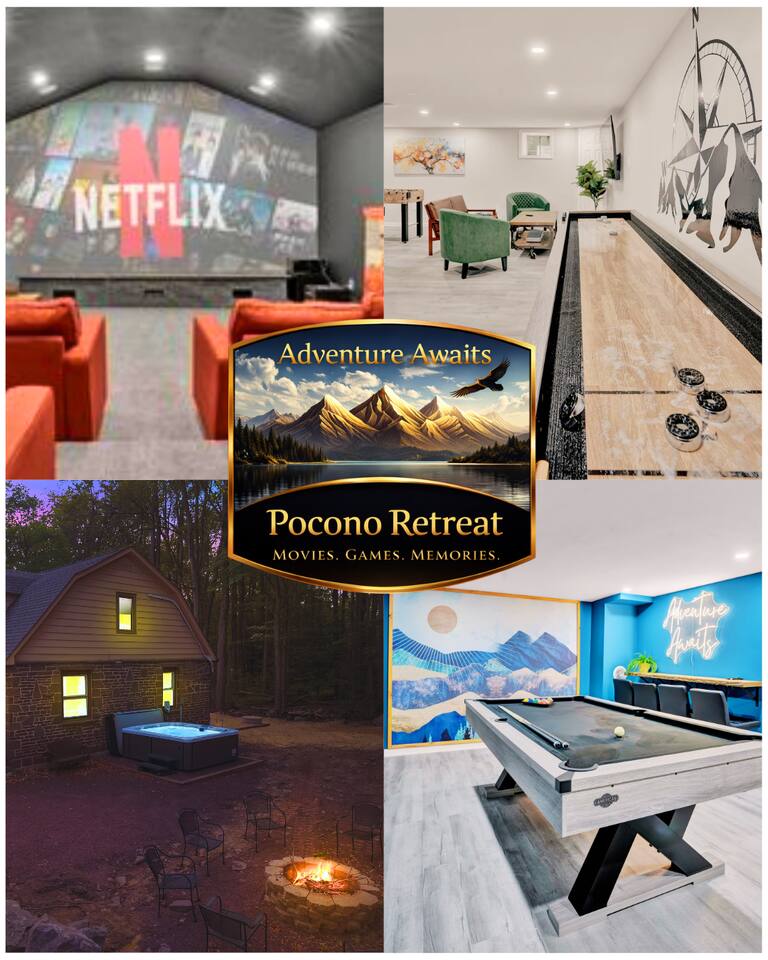 Lake Naomi Temporary Pass Available (>1 week reservation): On-season 1 left (June 27-Sept 4th) Off-season 2 left (all other dates of the year) 15 minute drive or less: • Camelback Ski Resort (10 miles) • Kalahari Water Park (6.5 miles) • Mount Airy Casino (10 miles) • Pocono Raceway (5.5 miles) • The Crossing Premium Outlets (13 miles) • Mount Pocono Airport (10 miles) 30 minute drive or less: • Jack Frost Ski Resort (18 mins/12 miles) • Split Rock Resort: H20ooohh!! Water Park (20 mins/12 miles) • Great Wolf Lodge Resort (20 mins/12 miles) • Big Boulder Mountain (21mins/12 miles) • Pocono Wine Trail (28 mins/ 20 miles) *Local Hikes: • Lake Naomi Greenway (across the street) • Hawk Falls (26 mins) • The Delaware Water Gap (30 mins) • Hickory Run Boulder Field (45 mins) • Jim Thorpe (45 mins) • Bushkill Falls (45 mins) The property: *5 bedroom, 2 bath – Sleeps 12 *3 tiered Movie Theater with projector and Google TV *Hot Tub *Pool Table, Shuffleboard, and Foosball Table *Sunroom with egg chairs *Fire Pit *Patio with Grill *Office desks with Wi-Fi up to 800mbps *Family Friendly (Pack ‘n Play, kids tent, and games) *A/C and heating via mini-splits and baseboard heater/forced air *Seasonal views of Lake Naomi Welcome to our newly renovated 3,000 sq/ft, 5-bedroom Chalet in Pocono Pines, PA nestled in the heart of Lake Naomi. Step inside and you’ll find a spacious living room and flat screen Smart 65” TV with ample seating for all guests. The kitchen is stocked with the essential cooking and eating utensils, a drip coffee maker and Keurig to make your favorite cappuccino or latte to get the morning started. Step downstairs into the newly finished basement for a range of fun activities to take part in, from playing pool, sliding the puck on the shuffleboard, scoring goals on the foosball table, or watching your favorite show on the two, big screen TVs. For topmost entertainment, step into the detached movie theater for a night to remember. We also have a washer and dryer in a utility room for keeping your clothes fresh and clean during your stay. Outside, you’ll discover a tranquil space. Relax by the fire pit or sip drinks while you enjoy the soothing heat from the hot tub. Cook up a feast on the propane BBQ grill and dine alfresco in the outdoor seating area. Bedroom Configuration On the main floor, your group has access to 3 bedrooms. Each bedroom has a different set up to maximize the ZZZs from a queen bedroom, another with bunk beds (full size), and the third having 2 twin beds and a trundle. Head upstairs where there are two primary bedrooms, each equipped with a King bed. One of the primaries has an additional twin bed for those close-knit families. *2 kings, 1 queen, 4 twins, and 1 bunk bed—2 full size beds* We look forward to hosting your adventure-filled getaway in the beautiful Pocono Mountains!